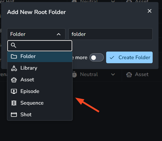 When creating a new folder under your project, you are only allowed to choose from the defined folder types.