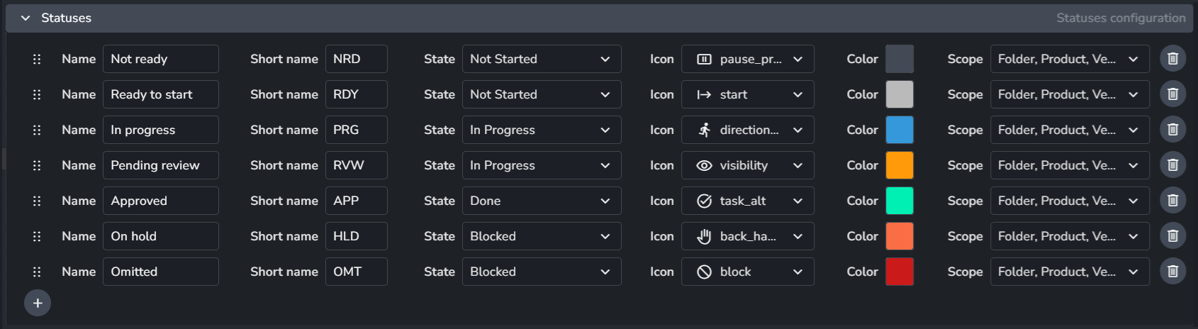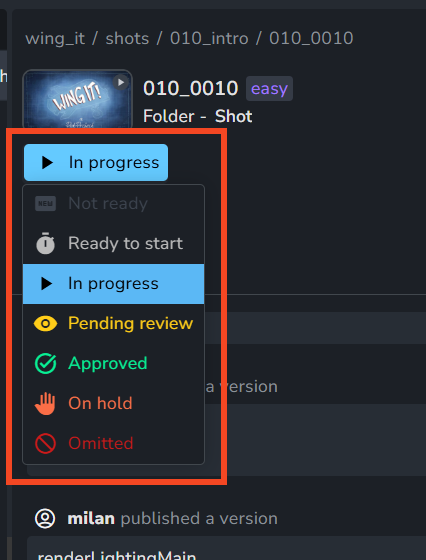 Any entity type (such as Folder, Product, Version, Representation, Task, or Workfile) can have a status defined within its scope. This means Folders and Tasks may share the same set of statuses, while a Version may have a completely different set. Each entity can only have one status assigned at a time.
