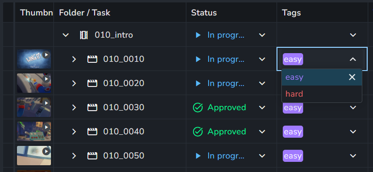 Tags can be anything and are supported on all entity types, including Folder, Product, Version, Representation, Task, and Workfile. An entity can have multiple tags or none at all.