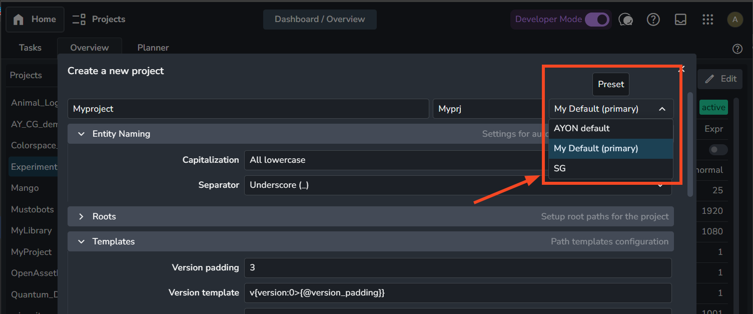 When creating a new project, AYON will prompt you to pick an anatomy preset to apply.