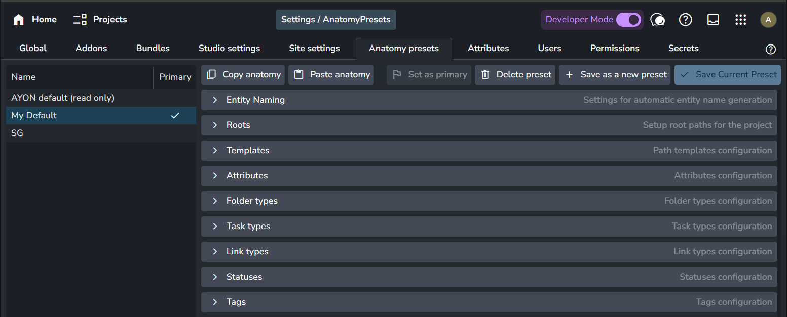 Anatomy presets are defined in the Studio Settings (S+S) within the Anatomy Presets tab. You can define many anatomy presets, but only one can be set as your primary anatomy preset.