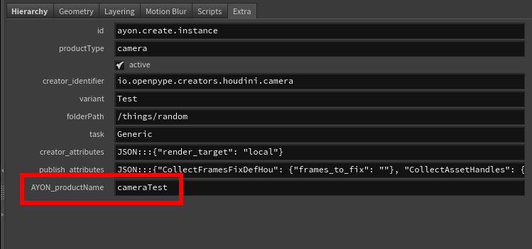 The default product naming profile consists of product type and variant name For example if you are creating a camera publish and set the variant to name Main Then Ayon will create a rop node with the name cameraMain.