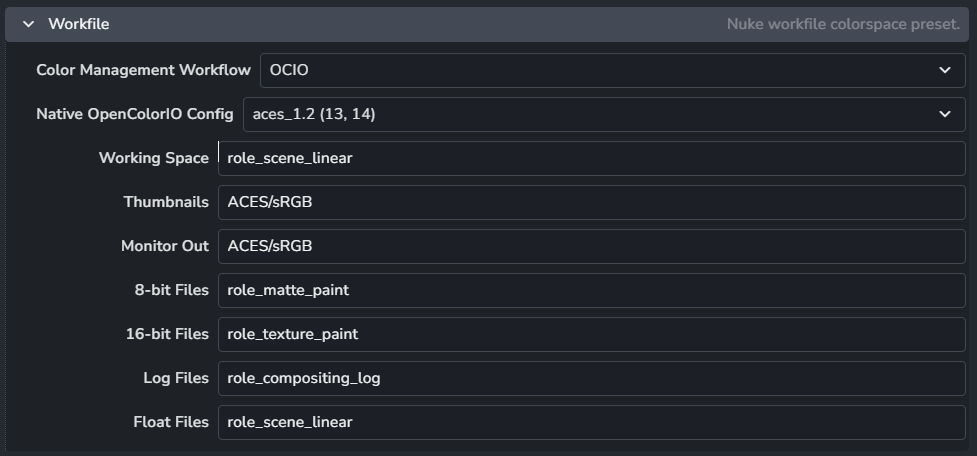 Color configuration for Nuke scripts and nodes and also override the global color management settings, check Host specific overrides.