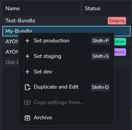 Productionstatus to your bundle.Duplicate and Edit: Create a new bundle from the selected bundle.