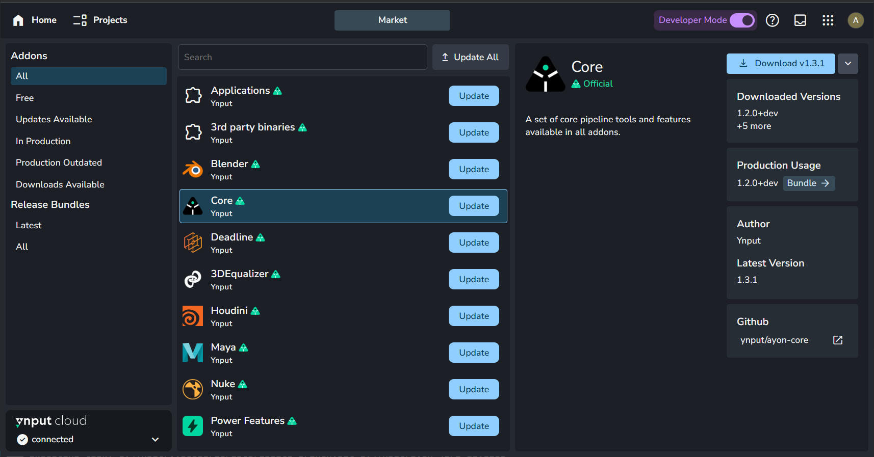 You can easily install or update existing AYON addons, launchers, and dependency packages on your server via Updating Pipeline to latest Release or by getting new addons from the AYON Market.