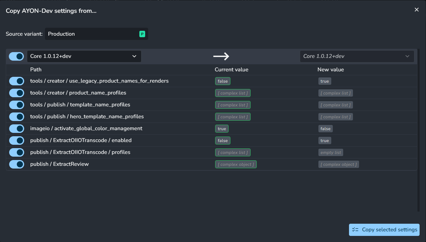 Each AYON addon has its own settings that can be adjusted to suit user preferences on multiple levels. When the default settings are changed, an "override" is created. You can create overrides at either the "Studio" or "Project" level.