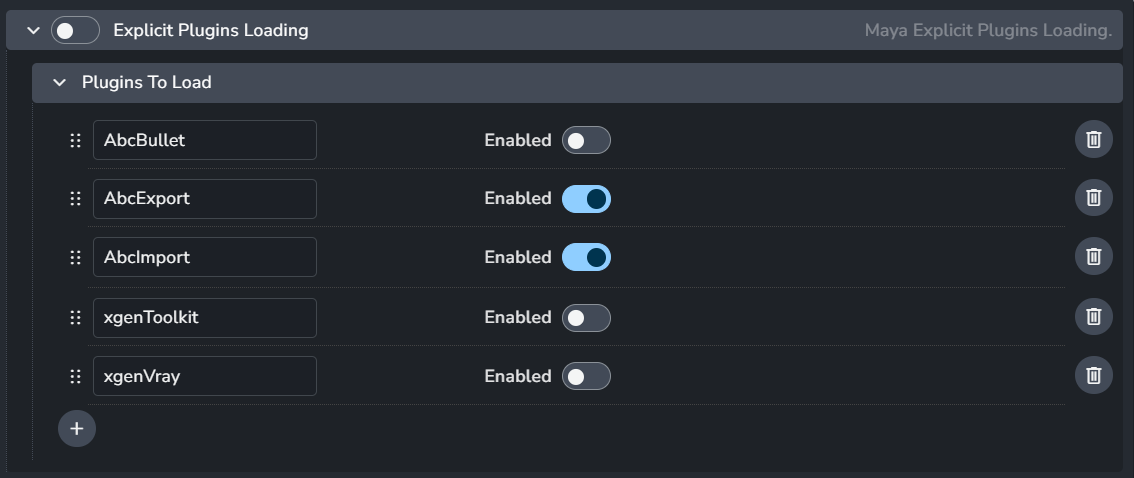 Defines a list of plugins to load using loadPlugin on launching Maya.