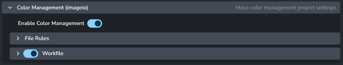 Workfile color management settings: When enabled, it sets the default Color Transform Preferences in Maya preferences. The settings below are applied on a 1:1 basis with those in Maya.