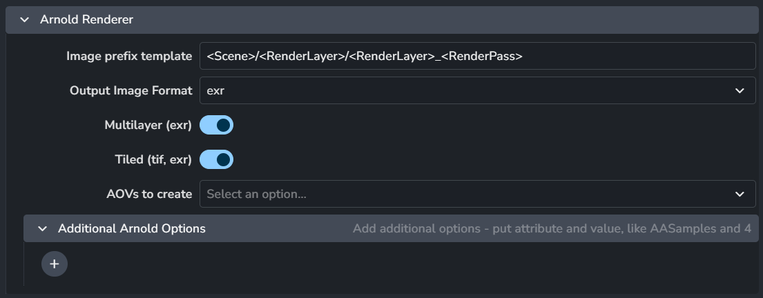 Additional Arnold Options: Add additional options - put attribute and value, like attribute