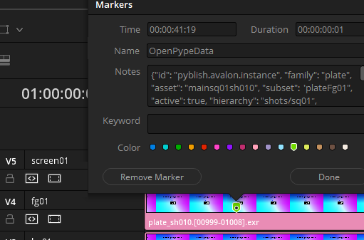 In Maya, AYON creates a set containing your selected mesh and adds AYON metadata as custom attributes on that set. | In Nuke, it creates a write node with your selection connected as input, and stores AYON metadata in a hidden knob on the node. | In DaVinci Resolve, it adds a marker to the selected clip in the timeline, with AYON metadata stored as notes on the marker. |
