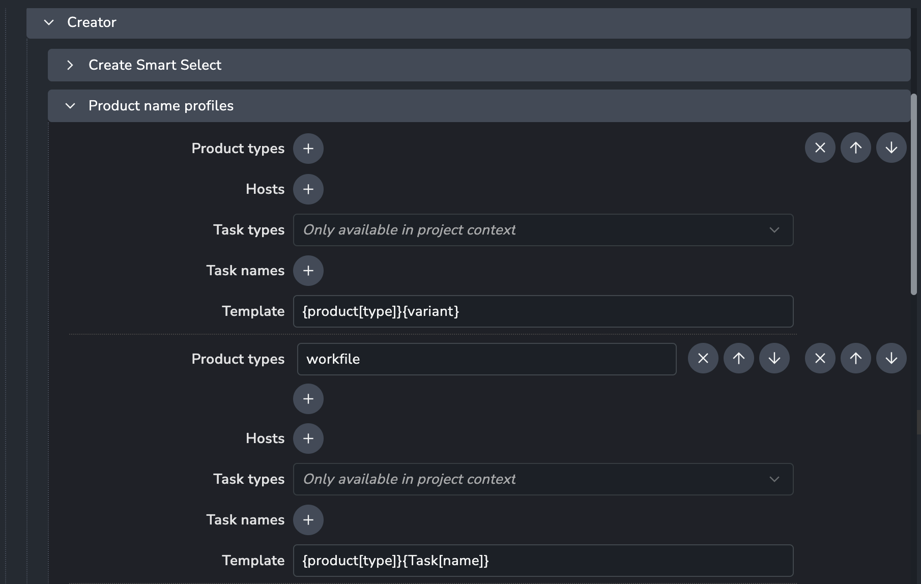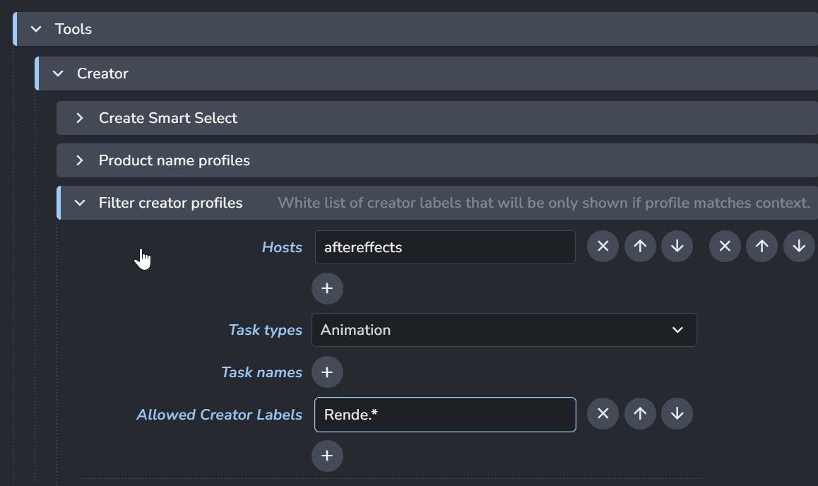 In the example shown above only available creators with labels starting with Render (eg. Render, RenderLOD etc.) for animation task started in AfterEffects. No other creators will be shown for use when this filter profile being active. No other DCCs or even tasks in AfterEffects would be affected.