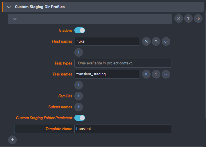 Families- Main family of processed product.["plate", "model"]Hosts- Host from which publishing was triggered.["maya", "nuke"]Task types- Current task.["modeling", "animation"]Tasks names- Current task.["model_characterA", "layout_sh010"]