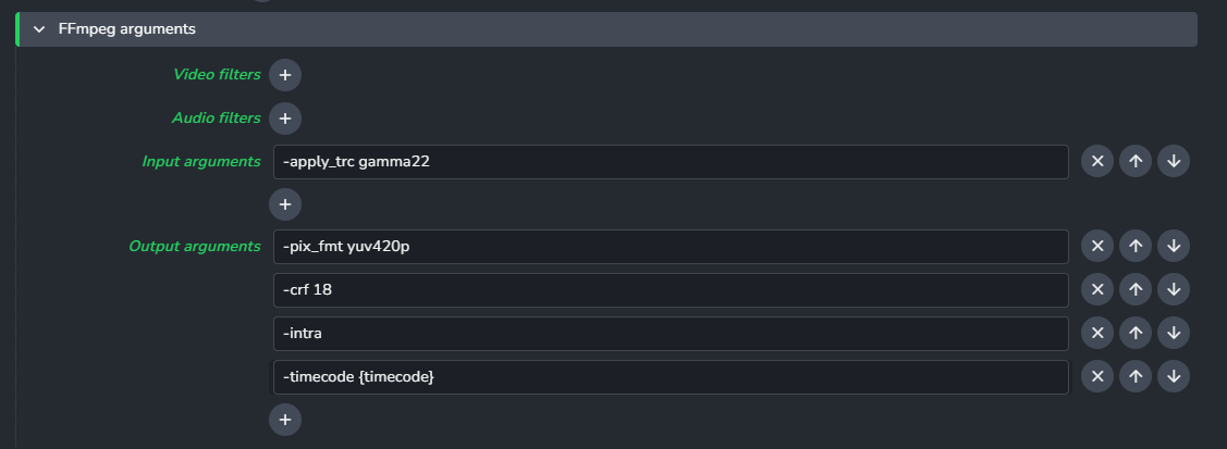 -filter:vor-vfcommand line arguments.Audio filters additional FFmpeg filters that would be defined in