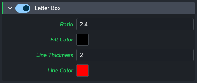 Ratio - Ratio of letter boxes. Ratio type is calculated from output image dimensions. If letterbox ratio > image ratio, letterbox is applied. Otherwise pillarbox will be rendered.